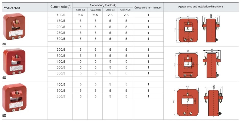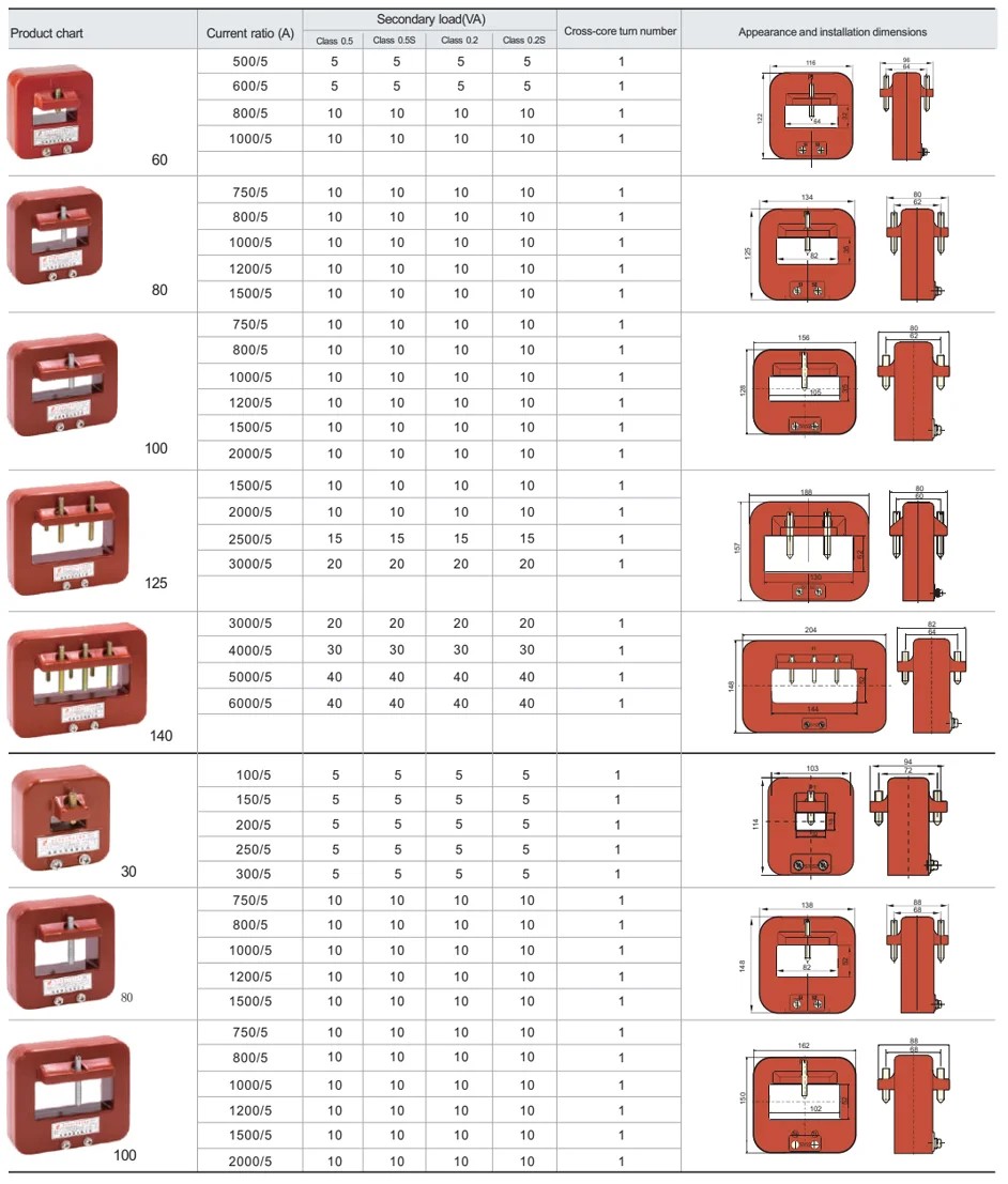 Модель Коефіцієнт номінального струму (A) Автобусний бар Прохідні повороти Точний рівень і номінальна потужність (VA)COSφ =0,8 Номінальний рівень ізоляції (кВ)